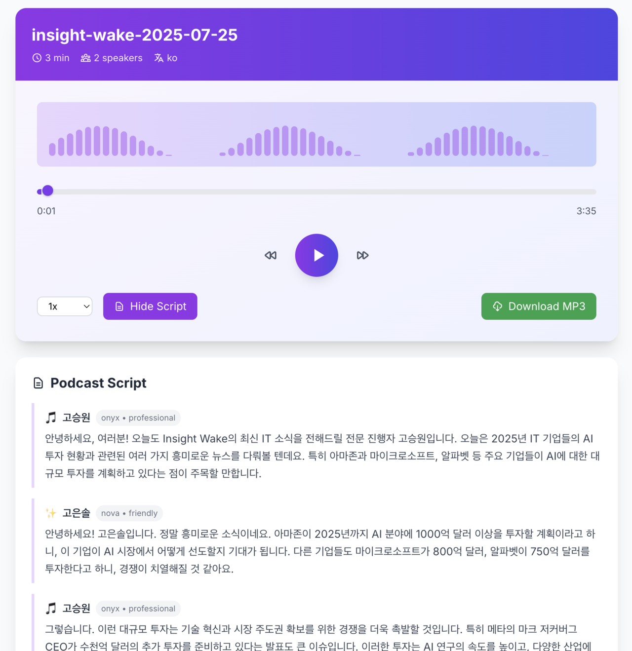 단 하나의 스크립트로, 다채로운 목소리의 AI 팟캐스트, 사내 방송, 오디오 강의를 즉시 제작하세요.